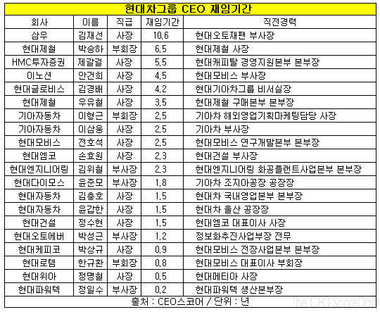 Çö´ëÂ÷±×·ì CEOµéÀÇ Æò±Õ ³ªÀÌ´Â 60¼¼·Î ´ëºÎºÐÀÌ... ÀÌ»ó Çö´ëÂ÷±×·ì¿¡ ¸ö´ãÀº Àι°µé·Î ³ªÅ¸³µ´Ù. 17ÀÏ... °á°ú, Çö´ëÂ÷±×·ì 18°³ °è¿»ç Àü¹®°æ¿µÀÎ 20¸íÀÇ... ƯÈ÷ Çö´ëÂ÷±×·ìÀÇ °£ÆÇÀÎ Çö´ëÂ÷¿Í ±â¾ÆÂ÷...
